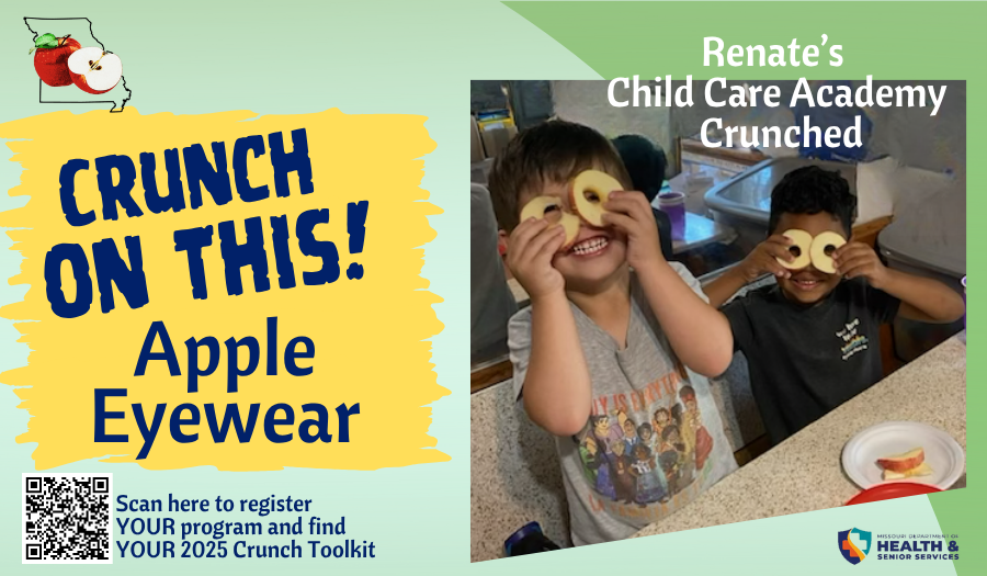 Renate’s Child Care Academy in St. Louis is a family child care owned by Renate Zahn. This marks the second year Renate and the children to participate in the Missouri Crunch Off. Renate loved joining in the fun last year, and this year's event brought even more excitement. The children made “apple eyeglasses” before topping them with delicious peanut butter for snack time. They also learned how to operate the apple peeler so they could make homemade applesauce again, a favorite from last year!